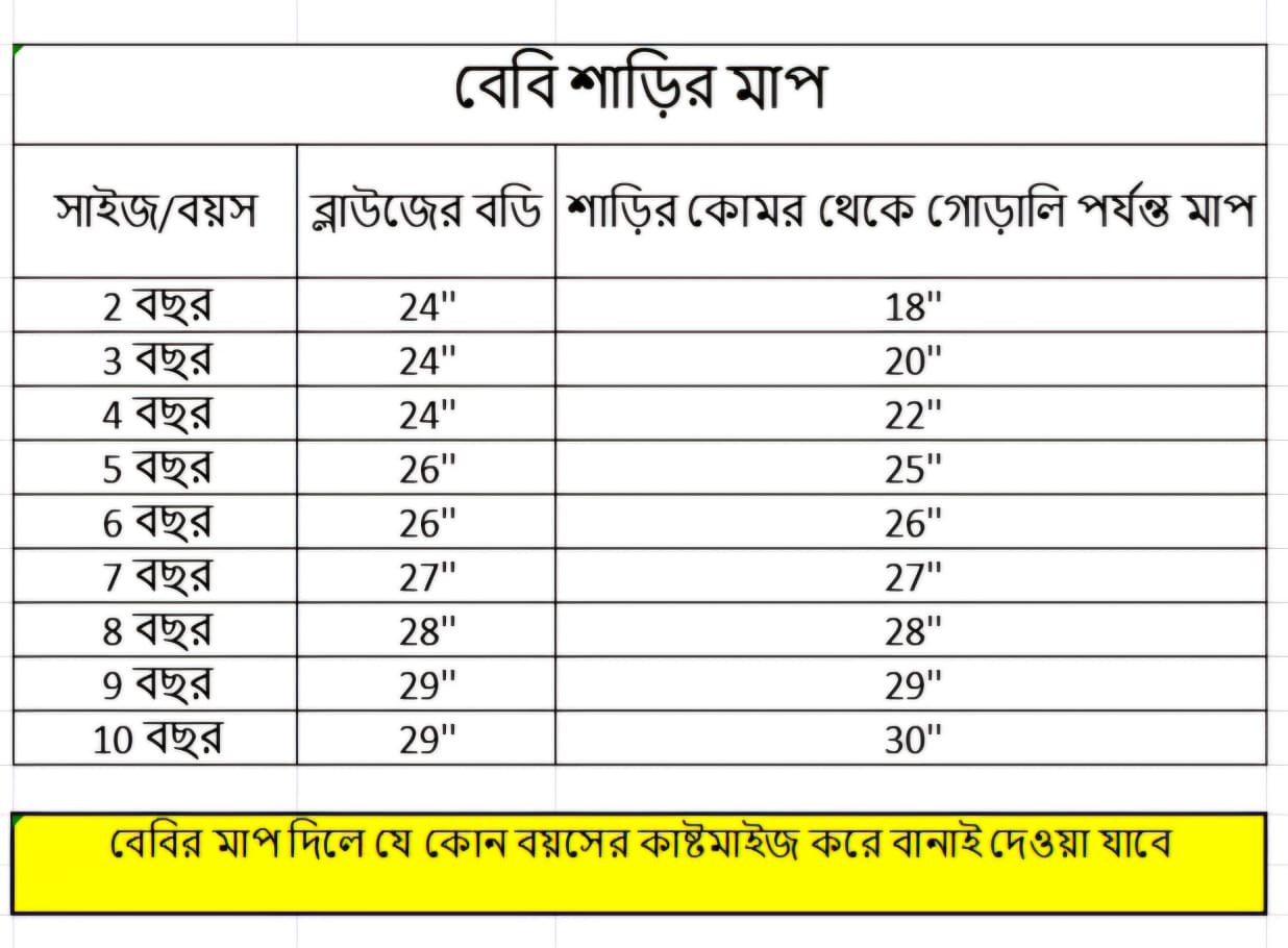 ০২. বেবির মাপ অনুযায়ী আমরা কাস্টমাইজ করে যেকোনো বয়সের রেডির শাড়ি দিয়ে থাকি।
